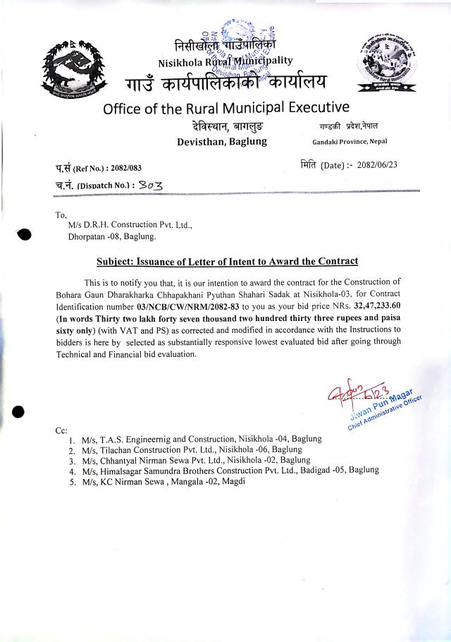 बोलपत्र स्वीकृत गर्ने आशयको सुचना ।।।