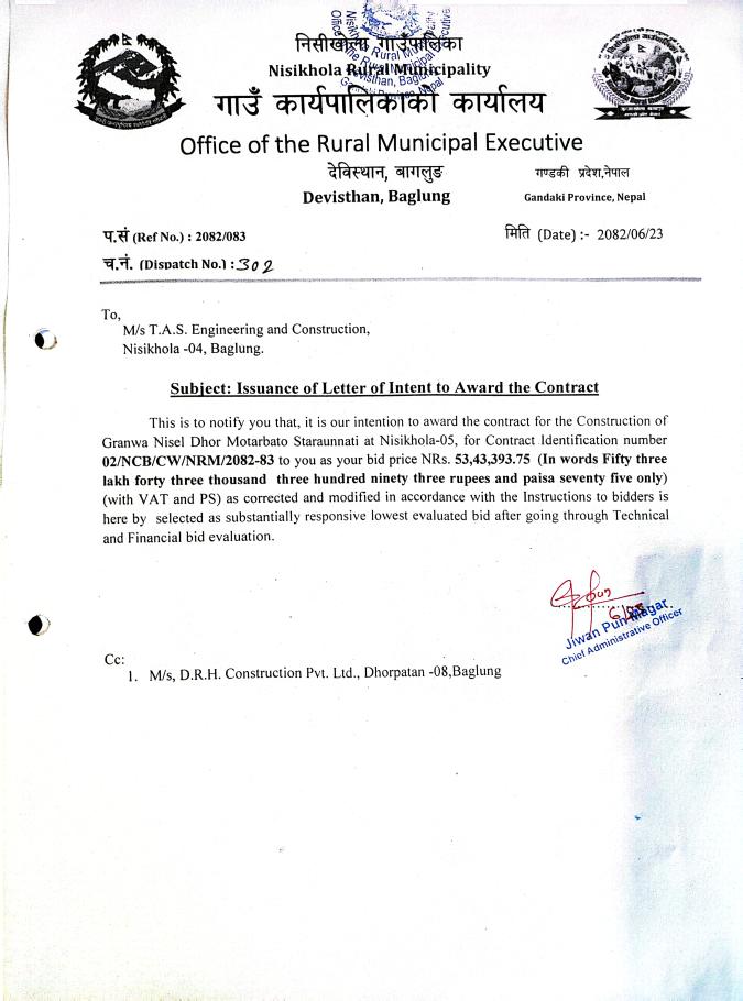 बोलपत्र स्वीकृत गर्ने आशयको सुचना ।।।