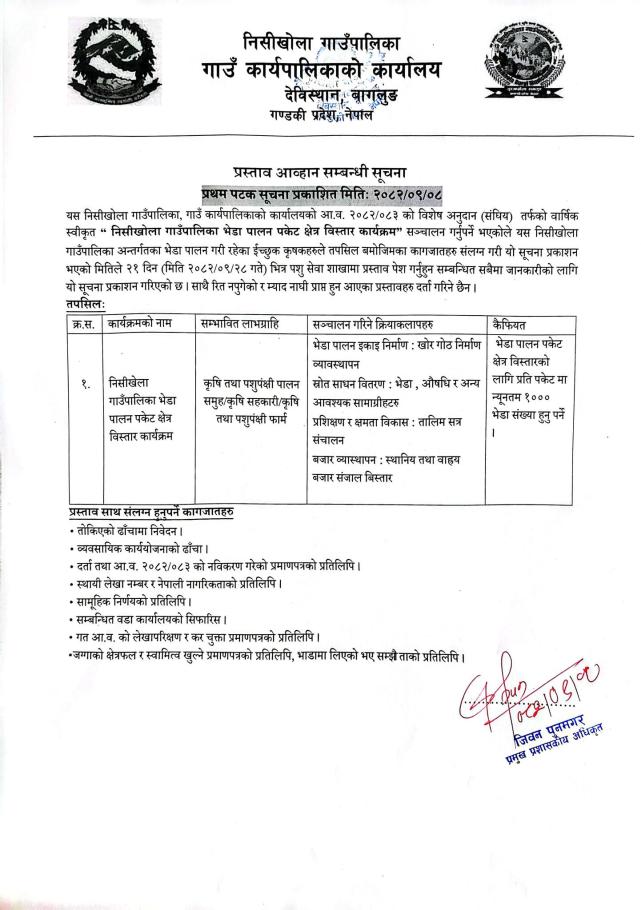 निसीखोला कृषि विकास शाखाको आ.व. २०८२/०८३ को कार्यक्रम संचालनको लागि आवेदन प्रस्ताव पेश गर्ने सम्बन्धि सूचना । प्रथम पटक प्रकाशित सूचना मितिः २०८२/०८/१०