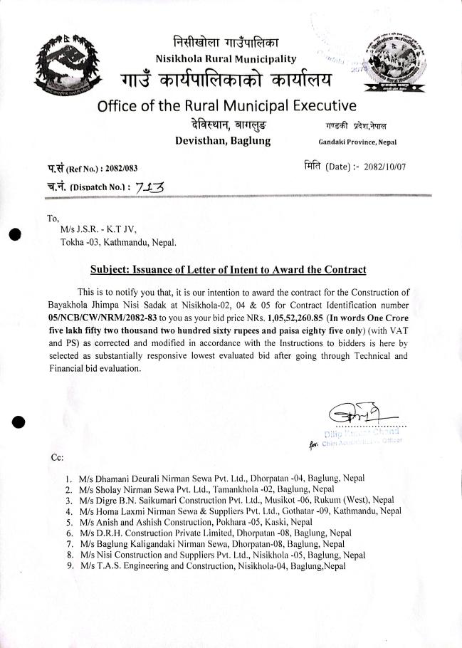 बोलपत्र स्वीकृत गर्ने आशयको सुचना ।।।