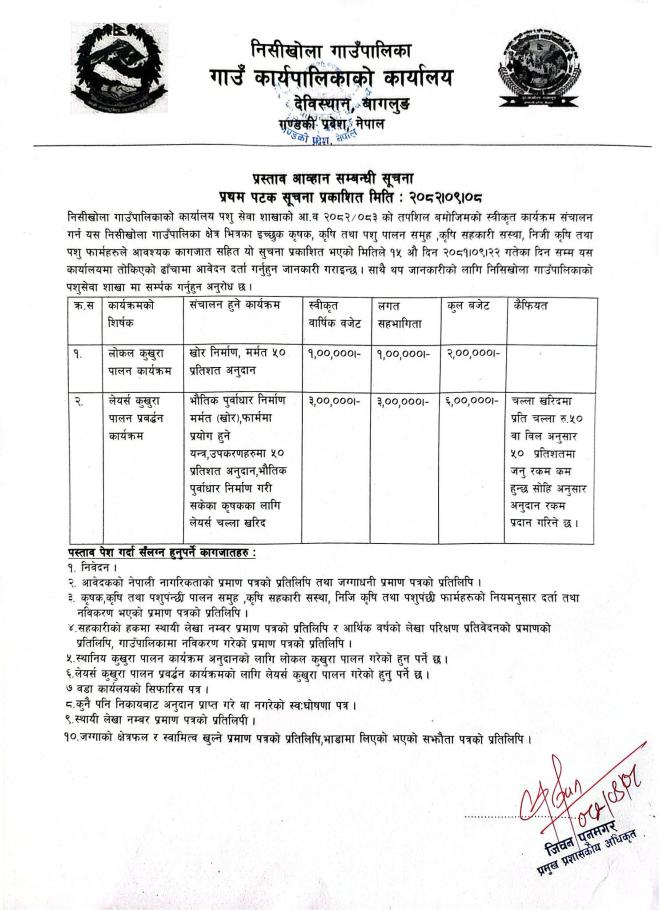 निसीखोला कृषि विकास शाखाको आ.व. २०८२/०८३ को कार्यक्रम संचालनको लागि आवेदन प्रस्ताव पेश गर्ने सम्बन्धि सूचना । प्रथम पटक प्रकाशित सूचना मितिः २०८२/०८/१०